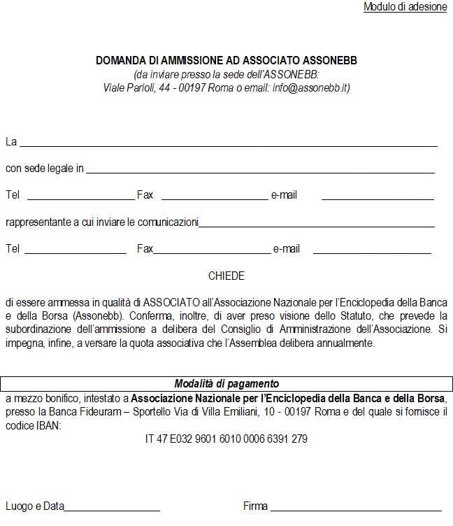 La partecipazione all’ASSONEBB è aperta a nuovi aderenti i quali assumono, con delibera del Consiglio di Amministrazione, la qualifica di “associati ordinari”.
